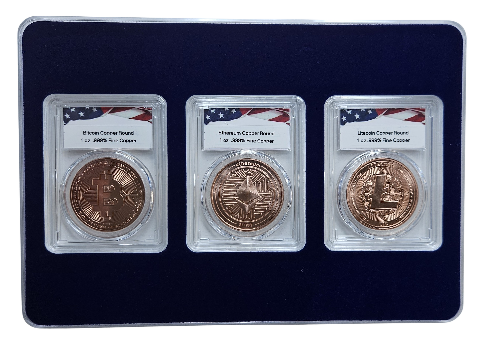 - COLLECTOR'S SET: Premium commemorative rounds featuring three major cryptocurrencies - Bitcoin, Ethereum, and Litecoin, each weighing 1 oz .